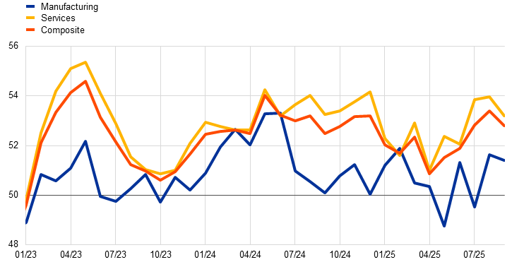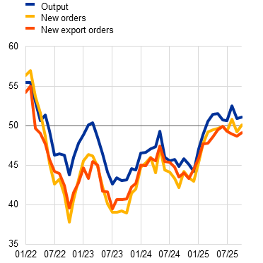 The available data point to persisting weakness in the manufacturing sector in the third quarter, while the services sector is likely to have continued to register positive growth. The composite output Purchasing Managers’ Index (PMI) continued to mark a slight upward trend in September, bringing the average indicator for the third quarter to 51.0. This is consistent with a positive – albeit modest – expansion in euro area economic activity, as higher tariffs, still-heightened uncertainty and a stronger euro negatively affected the manufacturing sector. Industrial production (excluding construction) decreased by 0.3% on average over July and August compared with the second quarter of 2025. The manufacturing output PMI decreased in September, compensating the temporary increase in August, with activity remaining broadly stagnant on average over the third quarter (Chart 4, panel a). The European Commission’s Economic Sentiment Indicator (ESI) for industry was unchanged in September and has been at low levels for many months. The ECB’s recent contacts with non-financial companies confirm this picture of sluggish growth, reporting that the manufacturing sector is being weighed down by tariffs and uncertainty amid sluggish demand, elevated operating costs and increasing global competition (see Box 5). Services sector growth is expected to have remained positive in the third quarter. The recent momentum in services production weakened slightly up to July, but survey data show an upward trend over the third quarter, with the PMI services activity reaching 51.3 in September (Chart 4, panel b). According to the ECB’s recent corporate contacts in the services sector, services activity has been driven by consumer spending on tourism, hospitality, entertainment and telecom services. It has also been boosted by a dynamic digital sector, reflecting the fact that many firms have stepped up efforts to modernise their IT infrastructures and integrate artificial intelligence into their operations.