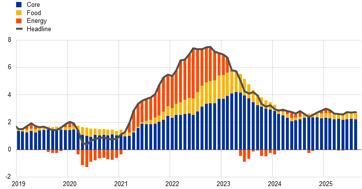 Energy inflation remained negative in September but rose to ‑0.4%, up from ‑2.0% in August. This increase mainly reflects a positive base effect from the low month-on-month rate of growth in prices for transportation fuels in September 2024 falling out of the annual rate calculation. The still negative annual rate of inflation in the energy component for September 2025 was due to small negative rates for all its main sub-components (transportation fuels, electricity and gas). At the same time, HICP inflation excluding energy remained unchanged, standing at 2.5% for the fifth consecutive month.