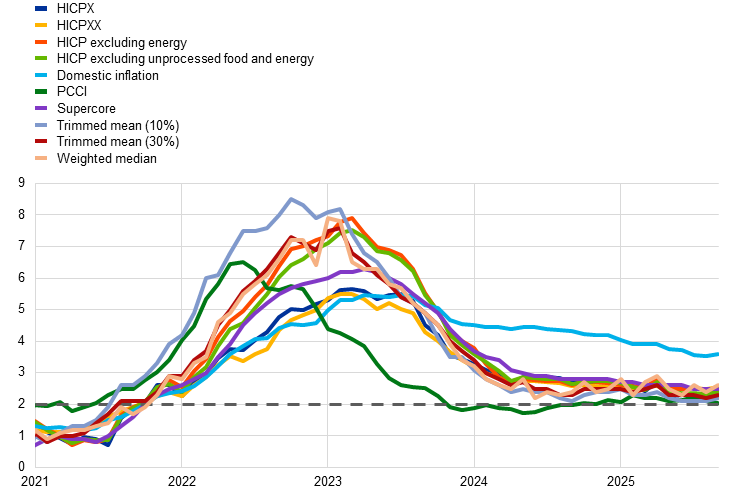 The cut-off date for data included in this issue of the Economic Bulletin was 29 October 2025. According to Eurostat’s flash estimate, released on 31 October, HICP inflation decreased to 2.1% in October 2025, down from 2.2% in September 2025.