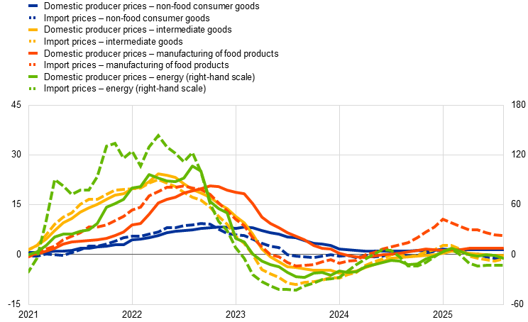 Energy prices declined, reflecting both lower oil prices amid a growing supply surplus in the oil market and a decrease in gas prices. Crude oil prices decreased by 4% as the market experienced growing demand-supply imbalances. On the demand side, prices were negatively affected by subdued global oil consumption following the economic disruptions triggered by US tariff announcements and, more recently, by renewed US-China trade tensions. On the supply side, a surplus has become evident in recent data showing elevated output from Iraq and Kuwait in September. These developments reflect successive OPEC+ production increases since April, which continued into early October. The oil market surplus is also apparent in a recent build-up of inventories in OECD countries and in China. However, the downward pressure on oil prices stemming from these demand-supply imbalances was partly offset in the most recent period as new US sanctions on Russian oil companies provided some price support. European gas prices declined by 4% in response to milder weather forecasts, which more than offset the impact of strikes at French liquified natural gas (LNG) import terminals. More broadly, prices continued their downward trend of recent months, reflecting persistently low European consumption relative to historical levels and weak LNG demand from Asia. Metal prices increased by 7%, primarily driven by a sharp rise in copper prices following production disruptions at the world’s second-largest mine in Indonesia. In contrast, international food commodity prices fell by 3% amid a decline in cocoa prices. The drop followed expectations of increased supply after both Côte d’Ivoire and Ghana raised the minimum price paid to cocoa farmers.