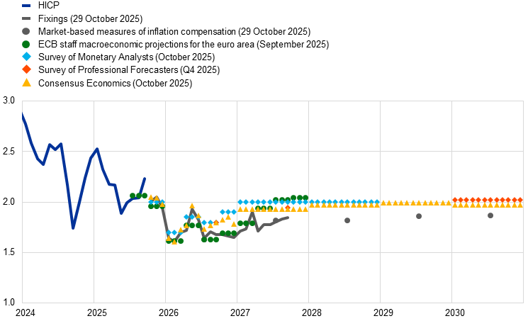 Annual euro area headline inflation increased to 2.2% in September 2025, up from 2.0% in August.[2] This rise was due mainly to energy prices falling by less than before. Indicators of underlying inflation remain consistent with the Governing Council’s 2% medium-term target. Annual growth in compensation per employee stood at 3.9% in the second quarter of 2025, unchanged from the previous quarter. While firms’ profits are recovering, wage growth is expected to ease over the remainder of the year and, together with rising productivity, contribute to a further moderation in labour costs. Most measures of longer-term inflation expectations still stand at around 2%, supporting the stabilisation of inflation around the target.
