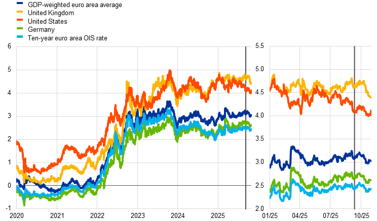 Since the last monetary policy meeting of the Governing Council on 11 September 2025, market rates have remained broadly unchanged. The past interest rate cuts have continued to reduce bank lending rates for firms, which averaged 3.5% in August. Meanwhile, the cost of issuing market-based debt remained at 3.5% in August, as the longer-term yields on which such debt is priced have been relatively stable.