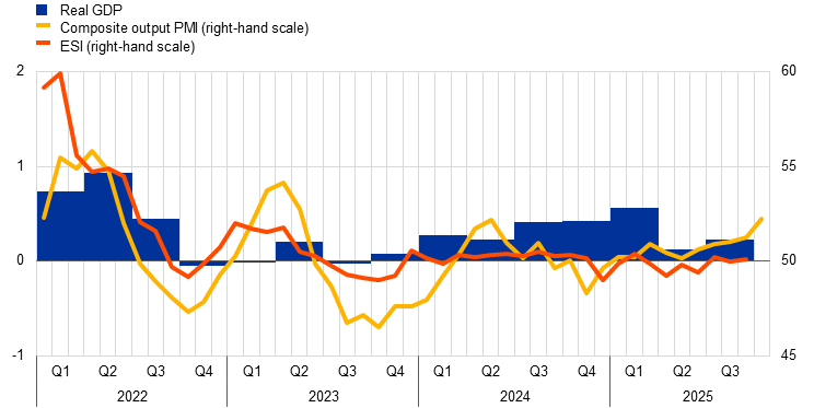 Notes: The two lines indicate monthly developments; the bars show quarterly data. The European Commission’s Economic Sentiment Indicator (ESI) has been standardised and rescaled to have the same mean and standard deviation as the composite output Purchasing Managers’ Index (PMI). The latest observations are for the third quarter of 2025 for real GDP, October 2025 for the composite output PMI and September 2025 for the ESI.