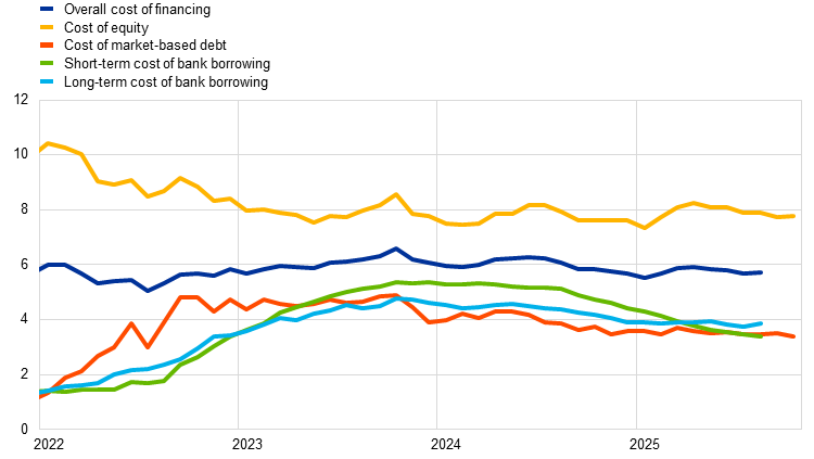 Notes: The overall cost of financing for non-financial corporations is based on monthly data and is calculated as a weighted average of the long and short-term costs of bank borrowing (monthly average data), market-based debt and equity (end-of-month data), based on their respective outstanding amounts. The latest observations are for 29 October 2025 for the cost of market-based debt and the cost of equity (daily data) and August 2025 for the overall cost of financing and the cost of borrowing from banks (monthly data).