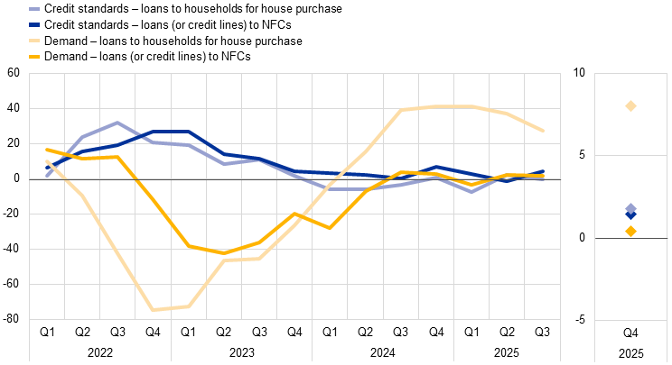 Notes: NFCs stands for non-financial corporations. For survey questions on credit standards, “net percentages” are defined as the difference between the sum of the percentages of banks responding “tightened considerably” and “tightened somewhat” and the sum of the percentages of banks responding “eased somewhat” and “eased considerably”. For survey questions on demand for loans, “net percentages” are defined as the difference between the sum of the percentages of banks responding “increased considerably” and “increased somewhat” and the sum of the percentages of banks responding “decreased somewhat” and “decreased considerably”. The diamonds denote expectations reported by banks in the current round. The latest observations are for the third quarter of 2025.