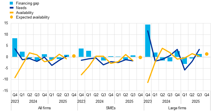 Firms reported that both their need for bank loans and the availability of such loans continued to be broadly unchanged and that the availability was expected to remain broadly stable over the next three months (Chart 20). The net percentage of firms reporting a decline in the availability of bank loans was 1%, compared with 1% having indicated an increase in the previous quarter. SMEs observed a small decline in the availability of bank loans (a net -2%, down from a net 1% perceiving an increase in the previous quarter), while large firms saw availability as unchanged (a net 0%). These developments are mirrored by the slight net tightening of credit standards for loans or credit lines granted to firms in the third quarter of 2025, as highlighted in the euro area bank lending survey. The bank loan financing gap indicator based on SAFE data – an index capturing the difference between changes in needs and availability – was broadly unchanged (a net 1% of firms experienced an increase in the financing gap, compared with a net -1% in the previous quarter). Looking ahead, firms expect the availability of external financing to remain broadly unchanged over the next three months, indicating a less optimistic outlook than in the previous survey round.