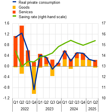 Following a moderation in the second quarter of 2025, private consumption growth likely strengthened somewhat in the third quarter – despite the still-elevated household saving rate – supported by gains in purchasing power. While spending on services continued to expand, the consumption of goods broadly stagnated in the second quarter, driven by a drop in non-durable goods (Chart 6, panel a). At the same time, the consumption of durable goods increased. The household saving ratio rose to 15.5% in the same quarter, as income continued to expand, while inflation and consumption growth moderated. Monthly data for the third quarter, albeit still preliminary and incomplete, point to a weakening in retail trade in July and August compared with the second quarter. By contrast, the results of the ECB’s Consumer Expectations Survey point to stronger goods consumption in the third quarter, while the ECB’s recent contacts with non-financial companies signal robust growth in services consumption, supporting the narrative of some improvement in spending momentum (see Box 5). Further survey evidence also corroborates this assessment. The European Commission’s consumer confidence indicator continued to recover in September and October, largely driven by improving expectations for the financial situation of households and major purchases in the next 12 months (Chart 6, panel b). In addition, the European Commission’s business expectations for demand in both retail trade and consumer services in the next three months have improved since the second quarter, returning to their pre-pandemic average levels. Looking ahead, consumption should continue to strengthen, amid a resilient labour market, with ongoing growth in income and improving household perceptions of past income gains. However, despite the easing seen since April 2025, the still-elevated consumer and economic policy uncertainty should continue to weigh on household consumption decisions.