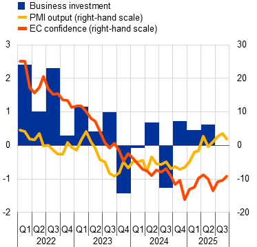 Notes: The lines indicate monthly developments, while the bars refer to quarterly data. The PMIs are expressed in terms of the deviation from 50. In panel a), business investment is measured by non-construction investment excluding Irish intangibles. Short-term indicators refer to the capital goods sector. The European Commission’s capital goods confidence indicator is normalised for the 1999-2019 average and standard deviation of the series. In panel b), the line for the European Commission’s activity trend indicator refers to the weighted average of the building and specialised construction sectors’ assessment of the trend in activity over the preceding three months, rescaled to have the same standard deviation as the PMI. The line for PMI output refers to housing activity. The latest observations are for the second quarter of 2025 for investment and September 2025 for PMI output and the European Commission’s indicators.