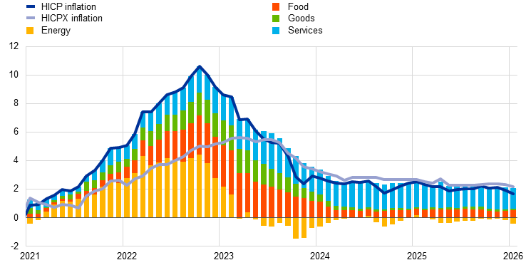 Annual euro area headline inflation, as measured in terms of the Harmonised Index of Consumer Prices (HICP), fell to 1.7% in January 2026, down from 2.0% in December 2025 (Chart 8). This decrease reflects a decline in energy inflation and in HICP excluding energy and food (HICPX) inflation. In the fourth quarter of 2025 euro area headline inflation stood at 2.1%, broadly in line with the December 2025 Eurosystem staff macroeconomic projections for the euro area.