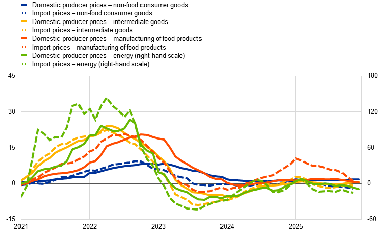 Energy inflation remained negative in January 2026, falling further to ‑4.1%, down from ‑1.9% in December 2025. This decline was driven primarily by a large downward base effect, as energy prices rose month on month, but at a slower pace than in January 2025. Data available up to December 2025 on the main energy sub-components show a fall in the annual growth rates of prices for electricity, gas and transportation fuels, with transportation fuels recording the sharpest drop.