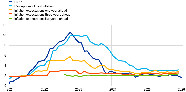 Annual euro area headline inflation decreased to 1.7% in January 2026, down from 2.0% in December 2025, owing to declines in energy inflation and inflation excluding energy and food.[3] Indicators of underlying inflation have changed little over recent months and remain consistent with the Governing Council’s 2% medium-term target. Annual growth in compensation per employee stood at 4.0% in the third quarter of 2025, unchanged from the previous quarter. Negotiated wage growth and forward-looking indicators, such as the ECB wage tracker and the results of surveys on wage expectations, point to a continued moderation in labour costs. Most measures of longer-term inflation expectations continue to stand at around 2%, supporting the stabilisation of inflation around the target.