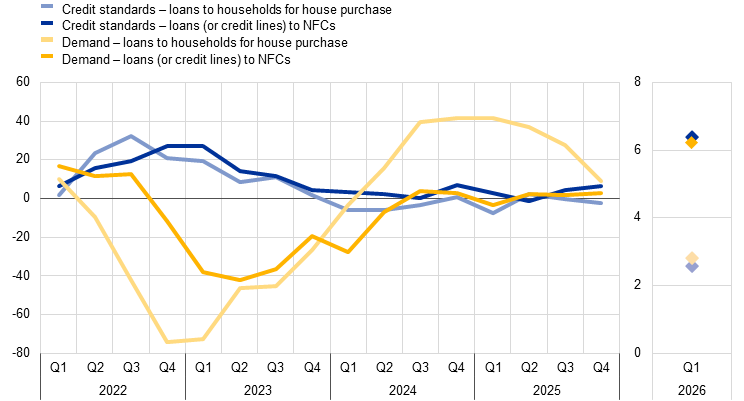 Notes: NFCs stands for non-financial corporations. For survey questions on credit standards, “net percentages” are defined as the difference between the sum of the percentages of banks responding “tightened considerably” and “tightened somewhat” and the sum of the percentages of banks responding “eased somewhat” and “eased considerably”. For survey questions on demand for loans, “net percentages” are defined as the difference between the sum of the percentages of banks responding “increased considerably” and “increased somewhat” and the sum of the percentages of banks responding “decreased somewhat” and “decreased considerably”. The diamonds denote expectations reported by banks in the current round. The latest observations are for the fourth quarter of 2025.