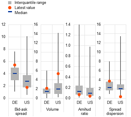 The US Treasury market is generally more liquid than euro area sovereign bond markets, according to a range of indicators. Bid-ask spreads on US Treasuries are typically lower than those on German Bunds – usually the most liquid sovereign bond market in the euro area. Trading volumes in US bond futures are also higher, while a measure of the price impact of trades (the Amihud ratio) is usually lower for US securities (Chart B, panel a). Market breadth is also stronger in the United States, as indicated by the smaller dispersion of bid-ask spreads across securities. Importantly, euro area sovereign bond markets remain more fragmented and heterogeneous, with multiple sovereign issuers that have differing credit quality, issuance practices and market structures.