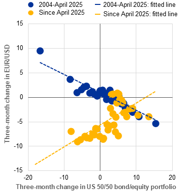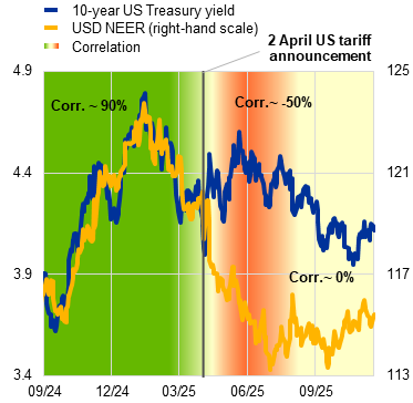 Market commentary has since debated whether the response to the April events was an isolated anomaly or a structural shift in asset price correlations. On the one hand, the change in the cross-asset correlation could have been a temporary phenomenon, driven by a one-off adjustment of global portfolios reflecting the desire of investors to reduce their exposure to US risk, which had been building up in the current business cycle. At the same time, it could also signal a fundamental shift in the perception of the safety of US dollar assets. This has been accompanied by suggestions of eroding confidence in US institutions (on the back of a tariff-focused trade policy, a retreat from international partnerships, concerns about the independence of the Federal Reserve System and big changes in the stance and composition of fiscal policy, among other things).[12]