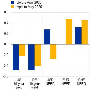 Empirical evidence confirms that the co-movement of safe-haven financial market variables was atypical in April. The typical positive correlation between US Treasury yields and the US dollar exchange rate, which had been especially strong for much of 2024, turned negative for a period after 2 April (Chart A.3, panel b). The correlation between a “safe-haven factor”, based on a principal component analysis of a range of safe-haven assets, and the US dollar and US Treasuries, further illustrates the different nature of the recent risk-off episode (Chart A.4, panel a).[8] The blue bars show the typical co-movement and the yellow bars show the co-movement in the period from April to May 2025. Typically, US Treasury yields co-move negatively with the safe-haven factor. Since 2 April, however, US yields have exhibited less negative co-movement with the safe-haven factor. Similarly, the US dollar typically appreciates following a deterioration in global risk sentiment, but this type of co-movement switched signs in April 2025.