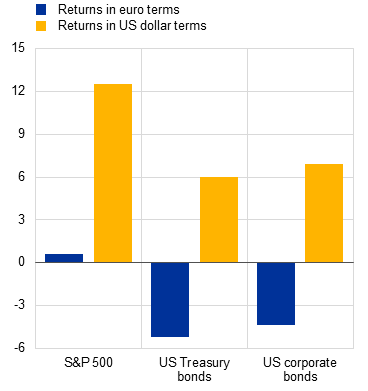 The depreciation of the US dollar exacerbated losses on US portfolio investments made by euro area investors. Unusually, the correlation between the return on a balanced US equity and debt portfolio and the change in the US dollar exchange rate against the euro turned positive (Chart A.5, panel a). After a temporary decline, many US asset prices recovered, but the US dollar exchange rate remained weak. In US dollar terms, the return on US assets has been positive, particularly on US equities which have rallied strongly (by around 13%) since the beginning of the year. Yet because of the double-digit depreciation of the US dollar against the euro since the beginning of the year, the return on the US dollar assets of euro area investors who have not hedged their currency risk has been eroded and has even turned negative for US Treasury and corporate bonds (Chart A.5, panel b). In particular, the total return for a US Treasury index, a traditional safe haven for risk-averse investors, was down by around 5 percentage points in euro terms. This potentially calls for the reassessment of unhedged dollar exposures in the portfolios of euro area and foreign investors.