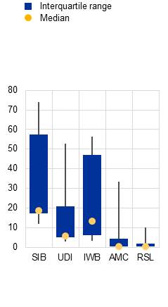 Notes: SIB stands for systemically important banks; UDI stands for universal and diversified institutions, which include universal banks and diversified lenders; IWB stands for investment and wholesale banks; AMC stands for asset managers and custodian banks; RSL stands for retail banks and small lenders; CRE stands for commercial real estate; REIT stands for real estate investment trust. Panel c: boxes show the interquartile range, dots denote medians, whiskers span the 5th to the 95th percentiles.