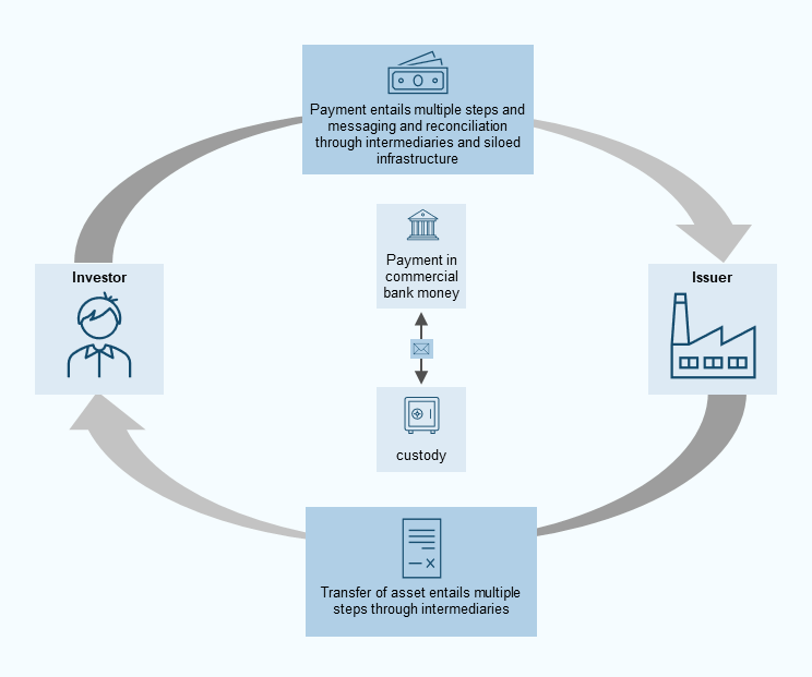 The key stages in the life cycle of an asset within the current system often involve inefficiencies and costs, some of which could be mitigated through tokenisation. The life cycle of an asset refers to the series of interconnected processes and activities involved in its creation, management, distribution and use in the markets. While there are variations between the life cycle activities of different types of asset, the following stages can be distinguished: i) asset structuring and issuance, ii) trading, iii) clearing and settlement, and iv) asset servicing. Under the current system, when an asset is transferred between entities, each party separately updates their own ledger or database, and messages are sent back and forth to reconcile the changes (Figure 1). Although the current system already operates efficiently, reconciliation processes still take time, sometimes involve manual intervention, and require coordination among multiple intermediaries, leading to friction, costs and delays. The promise of tokenisation and DLT lies in the creation of a shared transparent ledger, which would make it possible to perform these functions on the same platform, reducing reliance on fragmented infrastructure. The extent to which these benefits would materialise depends on whether platforms would develop in an integrated manner since the creation and maintenance of interfaces and communication links among separate platforms is costly.