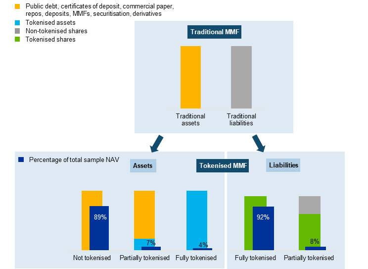 Notes: The chart shows the balance sheet compositions of TMMFs by tokenisation status as well as their total percentage share in our sample of TMMFs as listed in Table 1. Balance sheet shares shown in the chart are based on empirical data but have been stylised for readability. NAV refers to the net asset value of the fund. For funds with partially tokenised assets or liabilities, the entire tokenised NAV is included in the calculation of the proportion.