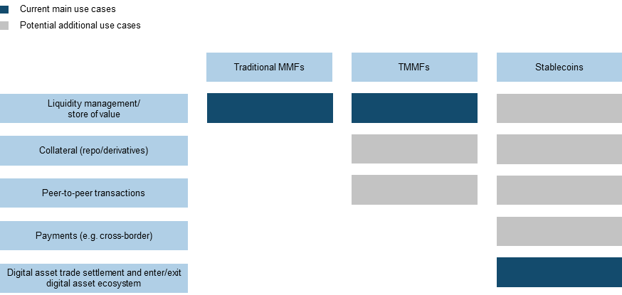 Notes: The figure shows the current main use cases of traditional MMFs, TMMFs and stablecoins, focusing on those most relevant for financial stability. These use cases reflect activities already observed in the market or discussed in industry reports. However, comprehensive data on the importance of specific use cases are currently limited. The potential use cases for “Collateral (repo/derivatives)” refers to derivatives and repo markets in both crypto and traditional finance. Stablecoins are mainly used in crypto-asset markets, while TMMFs are currently used in the digital asset ecosystem but may also be used in traditional markets in the future. “Enter/exit digital asset ecosystem” also includes on-/off-ramping for tokenised assets.