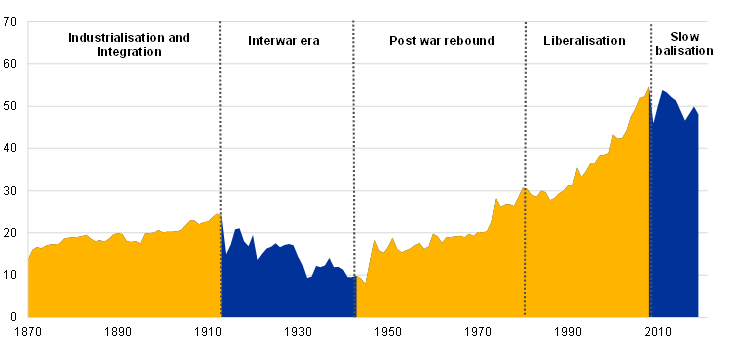 Sources: Based on Klasing, M.J. and Milionis, P. (2014), “Quantifying the evolution of world trade, 1870–1949”, Journal of International Economics, Vol. 92, No 1, January, pp. 185-197, and ECB staff calculations.