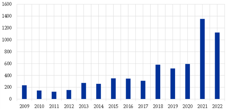 While this is not a new trend, it is a fact that protectionist tendencies – which had already increased in 2017-18 with the trade dispute between the United States and China – increased further after the COVID-19 pandemic (Chart 2). And they have intensified further still following Russia’s invasion of Ukraine. The EU – for decades a champion of openness and integration – has developed its Open Strategic Autonomy agenda in order to prevent dependencies becoming vulnerabilities.[9]