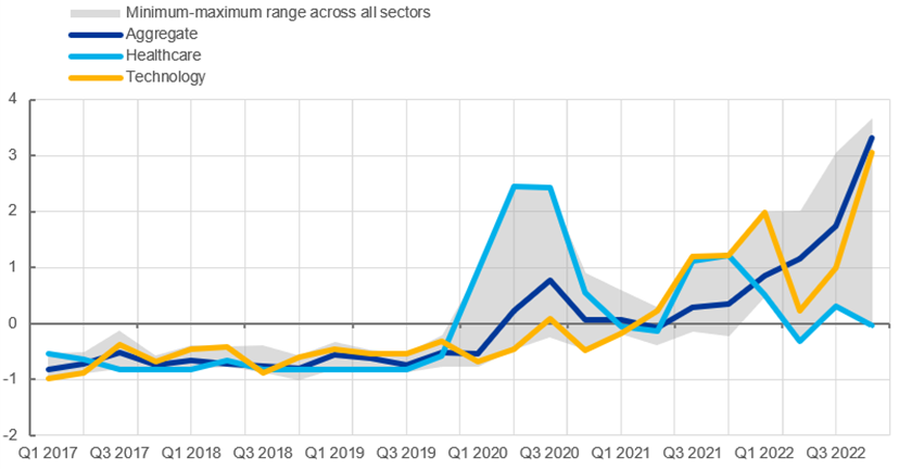Notes: The index captures the exposure (average number of mentions) of terms related to nearshoring, onshoring and friend-shoring in the transcripts of individual firms’ earnings calls. Global firms are considered, of which 50% are US firms and 23% are EU firms, based on the country of incorporation, if available. Ten sectors are considered: academic and educational services, basic materials, consumer cyclical goods, consumer non-cyclical goods, energy, financials, healthcare, technology, real estate, and utilities. The latest observations are for the fourth quarter of 2022.