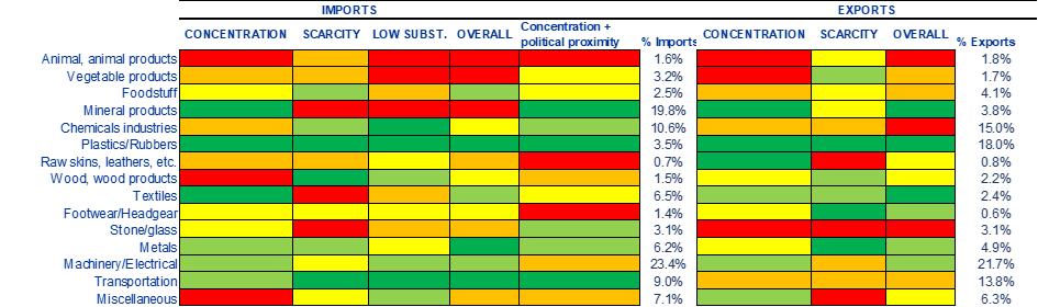Notes: The heatmap uses indicators of concentration, scarcity and substitutability (subst.) as defined in Box 2.1 of International Relations Committee Work stream on Open Strategic Autonomy (2023), op. cit. Sector-specific indicators are standardised by the mean and the standard deviation for the whole sample. Sectors are then classified and colour coded according to the quintile to which their z-scores belong, with scores closer to red signalling higher vulnerability. Individual indices are also aggregated to obtain an indication of “overall dependency”. The fifth column shows the import concentration index in which import shares are weighted with an indicator of “political proximity”, based on UN voting patterns and calculated following Bailey et al. (2017).