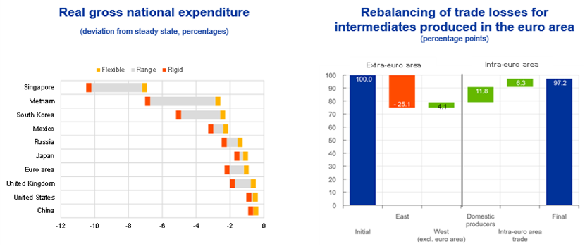 As per Campos R., Estefanía-Flores, J., Furceri, D. and Timini, J. (2022), “Trade Fragmentation”, Working Papers, Banco de España, simulations by Eurosystem staff that divide the world into three trading blocs – eastern, western and neutral – show that a fragmentation of the global economy taking us back to trade policy relations prevailing during the Cold War era would reduce exports from the eastern bloc to the western bloc by almost 20% and exports from the western bloc to the eastern bloc by roughly 27%. The neutral bloc would benefit from some trade diversion as it would attract some of the trade volume previously occurring between the two opposing blocs. The division into eastern, western and neutral blocks is based on how countries voted on the 7 April 2022 United Nations General Assembly Resolution concerning the suspension of the rights of membership of the Russian Federation in the Human Rights Council.