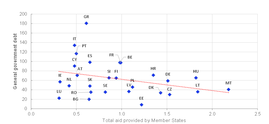Note: Data on general government debt and aid provided in 2019 are scaled by the GDP of the respective Member State during the same year.
