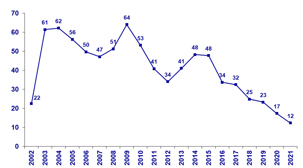 Verjetnost, da boste prejeli ponarejen bankovec, je zelo majhna, saj ostaja število ponaredkov v primerjavi s številom pristnih bankovcev v obtoku zelo majhno. V letu 2021 je bilo odkritih 12 ponaredkov na 1 milijon pristnih bankovcev v obtoku, kar je doslej najnižja raven (glej graf spodaj).