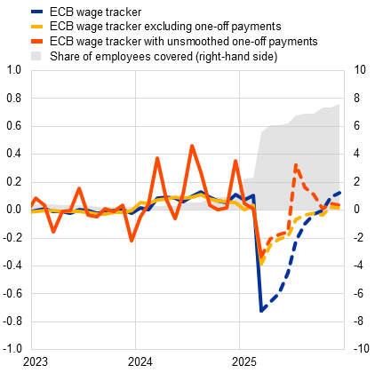 The European Central Bank wage tracker, which covers active collective bargaining agreements, indicates negotiated wage growth with smoothed one-off payments of 4.8% in 2024 (based on an average coverage of 48.8% of employees in participating countries), and 3.1% in 2025 (based on an average coverage of 46.5%). The ECB wage tracker with unsmoothed one-off payments indicates average negotiated wage growth level of 4.9% in 2024 and 2.8% in 2025. The steeply downward trend of the forward-looking wage tracker in 2025 partly reflects the mechanical impact of large one-off payments (that were paid in 2024 but drop out in 2025) and the frontloaded nature of wage increases in some sectors in 2024. The wage tracker excluding one-off payments indicates growth of 4.2% in 2024 and 3.8% in 2025. See Chart 1 and Table 1 for further details.