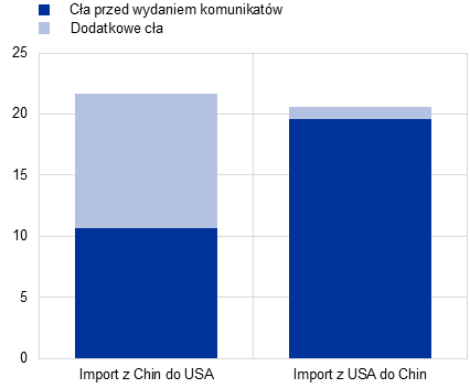 Wpływ tych dwustronnych ceł na projekcje dla strefy euro jest ograniczony, jednak Chiny mogą powtórzyć wcześniejsze modele przekierowania handlu. W 2018 cła USA na towary z Chin doprowadziły do przekierowania chińskiego eksportu na inne rynki, ponieważ amerykańskie łańcuchy dostaw zostały zmodyfikowane tak, aby ograniczyć zaopatrzenie bezpośrednio z Chin. Jeżeli Chiny przekierują swój eksport ze Stanów Zjednoczonych, strefa euro może doświadczyć spadku konkurencyjności zarówno na rynku wewnętrznym, jak i na rynkach trzecich. Jednocześnie możliwości zwiększenia udziału strefy euro w rynku USA mogą być ograniczone z uwagi na różnice pod względem zarówno jakości, jak i cen jej koszyka eksportowego w porównaniu z Chinami. Ogólnie oczekuje się jednak, że wpływ omawianych ceł na wzrost gospodarczy w strefie euro będzie jedynie nieznacznie negatywny. Uważa się, że cła uwzględnione w scenariuszu bazowym mają niewielki wpływ na inflację w strefie euro. Wynika to z tego, że ich wzrostowe oddziaływanie na ceny importu poprzez wyższe koszty w łańcuchach dostaw według oczekiwań zostanie zasadniczo zrównoważone przez spadkowy wpływ wyższej podaży towarów z Chin na rynkach europejskich.