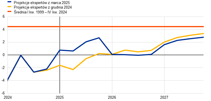 Na wzrost gospodarczy w strefie euro według przewidywań niekorzystnie wpływać będzie utrzymująca się wysoka niepewność dotycząca sytuacji geopolitycznej oraz polityki gospodarczej i handlowej, co spowolni oczekiwane ożywienie. Jest to następstwem nieco słabszego, niż przewidywano, wzrostu gospodarczego pod koniec 2024. Niepewność związana z polityką zarówno wewnętrzną, jak i handlową jest wysoka. Choć w projekcjach bazowych uwzględniono jedynie wpływ nowych ceł w handlu między Stanami Zjednoczonymi a Chinami, to zakłada się, że na eksporcie i inwestycjach w strefie euro odbiją się negatywne skutki niepewności dotyczącej możliwych dalszych zmian w światowej polityce handlowej, zwłaszcza wobec Unii Europejskiej. Ocenia się, że w połączeniu z utrzymującymi się wyzwaniami w zakresie konkurencyjności doprowadzi to do dalszego spadku udziału strefy euro w rynkach eksportowych. Mimo tych niekorzystnych czynników nadal panują warunki umożliwiające ponowne zwiększenie się dynamiki PKB w strefie euro w horyzoncie projekcji. Oczekuje się, że ożywieniu będą sprzyjać rosnące płace realne i wzrost zatrudnienia – przy silnym, choć spowalniającym, rynku pracy – a jednym z kluczowych czynników pobudzających wzrost pozostanie spożycie. Popyt wewnętrzny powinno także wspierać łagodzenie warunków finansowania, odzwierciedlone w oczekiwaniach rynku dotyczących przyszłej ścieżki stóp procentowych. Rynek pracy ma pozostać odporny – według oczekiwań stopa bezrobocia wyniesie średnio 6,3% w 2025, po czym obniży się do 6,2% w 2027. Przewiduje się, że produktywność w horyzoncie projekcji będzie rosnąć w miarę wygasania niektórych czynników cyklicznych, które w ostatnim okresie osłabiały jej dynamikę. Utrzymują się jednak problemy strukturalne. W sumie średnioroczna dynamika realnego PKB według oczekiwań wyniesie 0,9% w 2025, a następnie wzrośnie do 1,2% w 2026 i 1,3% w 2027. W porównaniu z projekcjami makroekonomicznymi ekspertów Eurosystemu z grudnia 2024 perspektywy wzrostu PKB na 2025 i 2026 zrewidowano w dół o 0,2 pkt proc., ale na 2027 pozostawiono bez zmian. Słabsze perspektywy wynikają głównie z rewizji w dół eksportu i – w mniejszym stopniu – obniżenia projekcji inwestycji. Te rewizje są odzwierciedleniem silniejszego, niż uprzednio zakładano, wpływu niepewności, a także oczekiwań, że wyzwania związane z konkurencyjnością prawdopodobnie utrzymają się dłużej, niż wcześniej przewidywano[1].