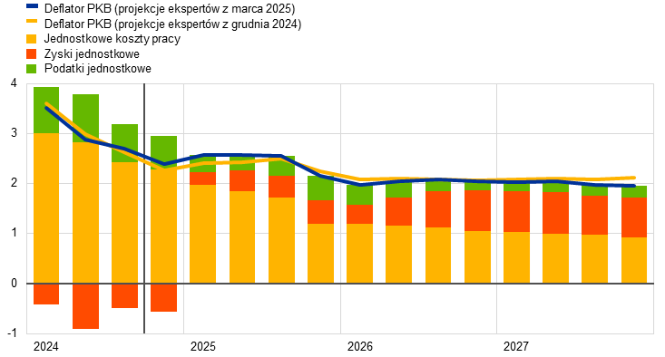 Przewiduje się, że wzrost jednostkowych kosztów pracy w 2026 i 2027 się zmniejszy, do czego przyczynią się spadek dynamiki płac i wzrost dynamiki produktywności. Wzrost jednostkowych kosztów pracy w czwartym kwartale 2024 wyniósł według szacunków 4,1% i do 2027 ma obniżyć się do średnio 1,7 %, zgodnie ze średnią historyczną. W porównaniu z projekcjami z grudnia 2024 dynamika jednostkowych kosztów pracy na 2025 została zrewidowana w górę o 0,4 pkt proc., głównie z powodu niższego wzrostu wydajności, a na 2027 – w dół o 0,3 pkt proc., przede wszystkim wskutek rewizji w dół dynamiki przeciętnego wynagrodzenia.