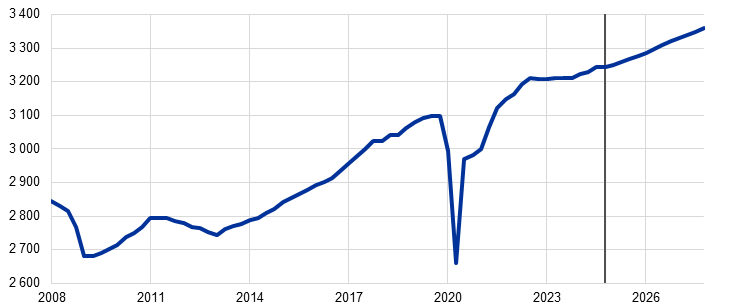 Według oczekiwań w średnim okresie dynamika realnego PKB ma się umacniać, pod wpływem wzrostu spożycia, odbicia inwestycji i popytu zewnętrznego oraz wygasania spowalniającego oddziaływania wcześniejszego zacieśnienia polityki pieniężnej (tabela 3). Dynamice spożycia prywatnego powinno sprzyjać trwające zwiększanie się siły nabywczej gospodarstw domowych, spowodowane utrzymującym się wzrostem płac i zatrudnienia oraz obniżaniem się inflacji. Według projekcji wydatki gospodarstw domowych będą nadal podtrzymywać ożywienie w średnim okresie, czemu ma sprzyjać także spadek stopy oszczędności gospodarstw domowych z obecnego, nadal wysokiego poziomu. Korzystny wpływ na dynamikę spożycia prywatnego powinny mieć również: odporny, choć spowalniający, rynek pracy i zakładany stopniowy wzrost zaufania konsumentów. Inwestycje mają się stopniowo zwiększać w horyzoncie projekcji, co wynika głównie z ustępowania spowalniającego oddziaływania wcześniejszego zacieśnienia polityki pieniężnej, a także z korzystnego wpływu wzrostu zysków, wydatkowania środków z programu Next Generation EU (NGEU) oraz poprawy popytu wewnętrznego i zewnętrznego. Oczekuje się, że ten ostatni czynnik będzie też wspierać dynamikę eksportu, jednak niepewność co do polityki handlowej, w połączeniu z długotrwałymi problemami związanymi z konkurencyjnością strefy euro, oznacza dalszy spadek udziału w rynkach eksportowych. Szacuje się, że trwające wycofywanie dyskrecjonalnych środków wsparcia fiskalnego wprowadzonych w reakcji na pandemię i kryzys energetyczny nadal będzie miało niewielki negatywny wpływ na dynamikę PKB w latach 2025−2027.