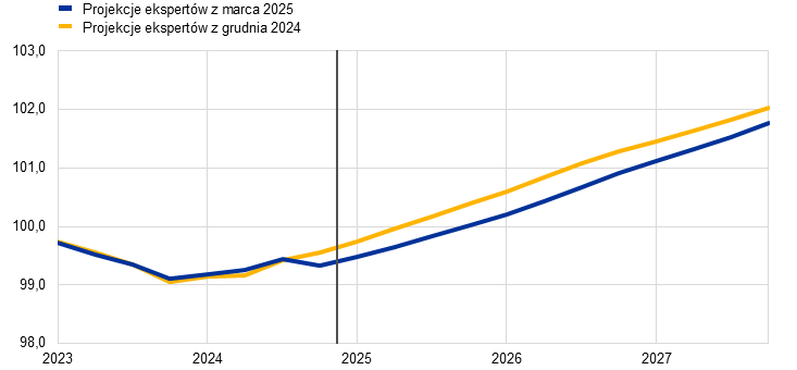 Inflacja HICP ogółem w ostatnich miesiącach wzrosła, ale według projekcji nieznacznie osłabi się w 2025, po czym spadnie i od pierwszego kwartału 2026 będzie oscylować wokół celu inflacyjnego EBC wynoszącego 2,0%. Oczekuje się, że na początku horyzontu projekcji dodatni efekt bazy w składowej „energia” i wyższa inflacja cen żywności zasadniczo zneutralizują spadkowe oddziaływanie obniżenia się inflacji HICP z wyłączeniem cen energii i żywności (HICPX). Wzrost cen surowców energetycznych, który nastąpił na przełomie roku, znajdzie odzwierciedlenie w rocznej dynamice cen energii w 2025. Choć zakłada się, że ceny ropy i gazu będą spadać zgodnie z przebiegiem cen terminowych, to w całym horyzoncie projekcji inflacja cen energii prawdopodobnie nadal będzie mieć wartości dodatnie, ale niższe od średniej historycznej. Według przewidywań do wzrostu inflacji cen energii w 2027 przyczyni się wprowadzenie nowych środków na rzecz łagodzenia zmiany klimatu. Inflacja cen żywności według projekcji będzie rosnąć do połowy 2025, głównie pod wpływem niedawnych znacznych wzrostów cen surowców żywnościowych, po czym obniży się do średnio 2,2% w 2027. Oczekuje się, że inflacja HICPX zacznie spadać na początku 2025, w miarę zanikania wpływu opóźnionych zmian cen, ustępowania presji płacowej i dalszego przekładania się na ceny konsumpcyjne oddziaływania wcześniejszego zacieśnienia polityki pieniężnej. Do tego obniżenia się inflacji HICPX według przewidywań przyczyni się głównie spadek inflacji cen usług, która dotąd była stosunkowo uporczywa. W sumie inflacja HICPX ma obniżyć się z 2,2% w 2025 do 1,9% w 2027. Dynamika płac powinna dalej spadać z obecnego, nadal podwyższonego poziomu w miarę ustępowania presji związanej z kompensacją inflacji. Oczekuje się, że to – w połączeniu z przewidywaną poprawą dynamiki produktywności – doprowadzi do znacznie wolniejszego wzrostu jednostkowych kosztów pracy. W rezultacie wewnętrzna presja cenowa powinna nadal się zmniejszać, a marże zysku rosnąć w horyzoncie projekcji. Oczekuje się, że zewnętrzna presja cenowa, odzwierciedlona w cenach importu, pozostanie umiarkowana, przy założeniu, że unijna polityka dotycząca ceł handlowych się nie zmieni. W porównaniu z projekcjami z grudnia 2024 perspektywy inflacji HICP ogółem na 2025 zrewidowano w górę o 0,2 pkt proc., ze względu na zakładane wyższe ceny surowców energetycznych i deprecjację euro, natomiast na 2027 – zrewidowano nieznacznie w dół z powodu nieco słabszych perspektyw dla składowej „energia” na koniec horyzontu projekcji.