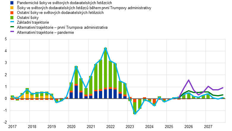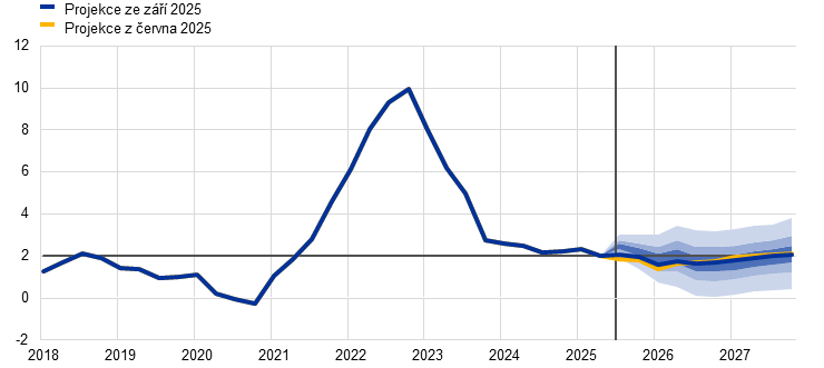 Výhled inflace odpovídá tomu, že se inflace stabilizuje poblíž 2% střednědobého cíle. Celková inflace, měřená harmonizovaným indexem spotřebitelských cen (HICP), by měla po zbytek roku 2025 kolísat poblíž 2 %, v roce 2026 klesnout na 1,7 % a následně se v roce 2027 zotavit na úroveň 1,9 %. Pokles v roce 2026 odráží další postupné snižování cen neenergetických složek, zatímco růst cen energií by měl zůstat volatilní, ale v horizontu projekcí by měl zesílit, částečně v důsledku spuštění systému EU pro obchodování s emisemi ETS2 v roce 2027. Očekává se, že ceny potravin zpočátku i nadále porostou rychleji, neboť se projeví zpožděné dopady dřívějšího růstu cen mezinárodních potravinářských komodit. V letech 2026 a 2027 by však růst měl zmírnit na úroveň mírně nad 2 %. Inflace měřená HICP bez započtení energií a potravin (HICPX) by měla klesat s tím, jak poleví mzdové tlaky a zmírní se růst cen služeb a jak se posilování eura projeví v cenovém řetězci a omezí růst cen zboží. Očekává se, že nižší růst mezd vyplývající z již realizované kompenzace ztrát reálných mezd v minulosti a oživení růstu produktivity povedou k výrazně pomalejšímu růstu jednotkových mzdových nákladů. V porovnání s projekcemi z června 2025 byl výhled celkové inflace měřené HICP revidován pro rok 2025 i 2026 o 0,1 procentního bodu směrem nahoru. Důvodem jsou vyšší aktuální údaje o cenách energetických komodit i předpoklady o jejich budoucím vývoji a také zpožděné účinky vyšších mezinárodních cen potravinářských komodit, které převažují nad posílením eura. Očekává se, že v roce 2027 budou převládat zpožděné účinky posilování eura, což povede k revizi o 0,1 procentního bodu směrem dolů.