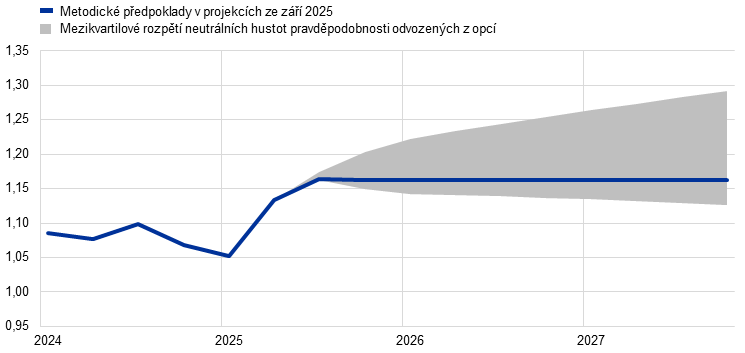 Tato citlivostní analýza hodnotí dopady alternativních trajektorií směnného kurzu, které naznačují možnost dalšího tlaku na posilování eura, a naznačují tak rizika zpomalení hospodářského růstu a inflace. Metodické předpoklady pro směnné kurzy uvedené v základním scénáři projekcí jsou v horizontu projekcí považovány za konstantní. Alternativní nižší a vyšší trajektorie jsou odvozeny od 25. a 75. percentilu neutrálních hustot pravděpodobnosti odvozených z opcí pro směnný kurz USD/EUR ke dni 15. srpna 2025, přičemž toto rozpětí bylo vychýleno ve směru posilování eura (graf 16). Dopady těchto alternativních trajektorií jsou hodnoceny pomocí makroekonomických modelů odborníků ECB a Eurosystému. Průměrný dopad na hospodářský růst a inflaci napříč těmito modely je uveden v tabulce 7.