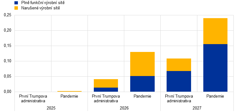Makroekonomické dopady na eurozónu jsou v případě první alternativní trajektorie minimální, ale výrazné v rámci druhé alternativní trajektorie s extrémnějšími poruchami v dodavatelských řetězcích, stejně jako během pandemie. Zaměříme-li se nejprve na výsledky v případě ekonomiky s plně fungujícími výrobními sítěmi a s využitím modelu ECB-BASE, a to u trajektorie s překážkami v dodávkách podobnými těm během první Trumpovy administrativy, vznikly by pouze minimální inflační tlaky, přičemž inflace měřená HICP by byla v roce 2027 o méně než 0,1 procentního bodu vyšší (graf 20, panel b, modré sloupce). Scénář s podobnými šoky, jaké nastaly během období pandemie, by vedl k výraznějším dopadům na inflaci, přičemž inflace měřená HICP by byla v roce 2027 až o 0,15 procentního bodu vyšší (graf 20, panel b, modré sloupce). V obou citlivostních analýzách je dopad na reálný HDP zanedbatelný nebo mírně kladný a odráží předpoklad nezměněných úrokových sazeb, což při vyšší inflaci implikuje snížení reálných úrokových sazeb, které by hospodářskou aktivitu podpořilo (graf 20, panel a, modré sloupce). Analýza je rozšířena pomocí víceodvětvového modelu pro více zemí, který zohledňuje vstupní a výstupní vazby, přičemž kromě dodavatelských řetězců jsou překážky také ve výrobních sítích. Tento předpoklad snižuje nahraditelnost v rámci výrobních řetězců a vedl by k výraznějším efektům (graf 20, žluté sloupce). V tomto případě by inflace ve srovnání se základním scénářem mohla být v roce 2027 ve scénáři první Trumpovy administrativy až o 0,1 procentního bodu vyšší a v extrémnějším pandemickém scénáři o téměř 0,25 procentního bodu vyšší a růst HDP by byl mírně tlumen.[19]