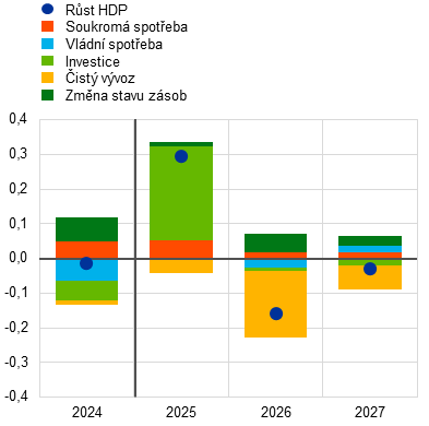 Růst reálného HDP by měl být i nadále tažen soukromou spotřebou. Z pohledu výdajů (graf 2 –, panel a) by soukromá spotřeba měla po celý horizont projekcí výrazně růst a poskytovat tak největší příspěvek k růstu reálného HDP. Navíc by se měla v letech 2025–2027 každoročně zvyšovat vládní spotřeba a celkové investice, přičemž soukromé investice by měly v roce 2027 vyrovnat očekávaný silný propad veřejných investic vyplývající z ukončení platnosti grantového financování v rámci NGEU. Naopak se předpokládá, že příspěvek čistého vývozu k růstu reálného HDP bude v letech 2025 a 2026 záporný – s přispěním dovozu (−1,2 procentního bodu, resp. −0,9 procentního bodu) předstihujícím vývoz (0,6 procentního bodu, resp. 0,5 procentního bodu) – to je však částečně vyrovnáno kladným příspěvkem změny stavu zásob v roce 2025 (graf 2, panel b). Vysoce volatilní změny zásob v roce 2025 souvisejí s budováním a snižováním zásob v souvislosti s vlivy předzásobení a jejich odezníváním.