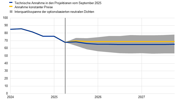 Gegenüber den Projektionen vom Juni 2025 sind die wichtigsten Änderungen der technischen Annahmen höhere Ölpreise, niedrigere Gas- und Rohstoffpreise und ein stärkerer Euro-Wechselkurs. Die Zinsannahmen bleiben indes weitgehend unverändert. Die Ölpreisannahmen wurden für 2025 bis 2027 um durchschnittlich rund 3 % nach oben und die Strompreisannahmen um rund 2 % nach oben revidiert, während die Annahmen für die Großhandelspreise für Gas etwas nach unten revidiert wurden. Auch für im EU-Emissionshandelssystem 1 gehandelte Zertifikate (EU-EHS1-Zertifikate) wird ein etwas niedrigerer Preis angenommen, während der Preis für das EU-Emissionshandelssystem 2 (EU-EHS2) unverändert gelassen wurde. Die Preise für Rohstoffe ohne Energie wurden leicht nach unten revidiert. Der Euro hat seit den Projektionen vom Juni zum US-Dollar um 3,3 % und in nominaler effektiver Rechnung um 2,3 % aufgewertet. Die Annahmen für die Zinssätze sind weitgehend unverändert.