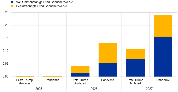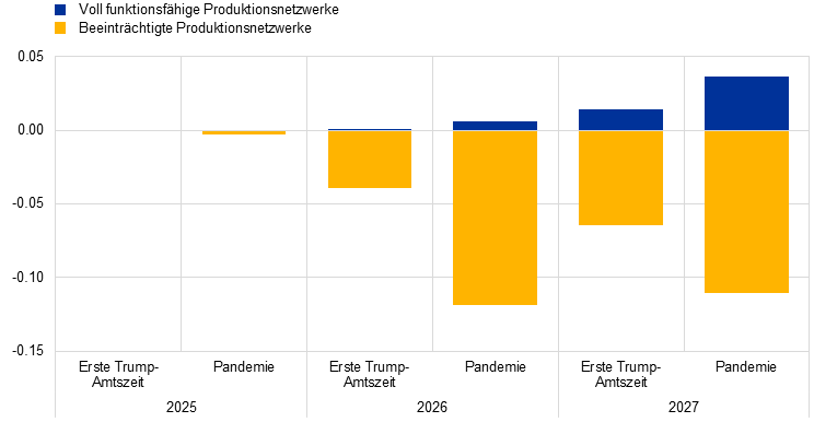 Die makroökonomischen Auswirkungen auf den Euroraum sind in der ersten divergierenden Entwicklung minimal. Im zweiten Szenario sind die Auswirkungen hingegen beträchtlich. Letzteres berücksichtigt extremere Lieferkettenstörungen wie sie während der Pandemie auftraten. Betrachtet man zunächst die Ergebnisse einer Volkswirtschaft mit voll funktionsfähigen Produktionsnetzwerken und verwendet das ECB-BASE-Modell, so würde sich in dem Szenario mit ähnlichen Lieferengpässen wie während der ersten Trump-Amtszeit nur ein minimaler Inflationsdruck ergeben. Hier würde die HVPI-Inflation im Jahr 2027 um weniger als 0,1 Prozentpunkte höher ausfallen (siehe Abbildung 20, Grafik b, blaue Balkenabschnitte). Das Szenario mit ähnlichen Schocks wie während der Pandemie würde zu stärker ausgeprägten Inflationseffekten führen: Die HVPI-Inflation würde im Jahr 2027 um bis zu 0,15 Prozentpunkte höher ausfallen (siehe Abbildung20, Grafik b, blaue Balkenabschnitte). In beiden Sensitivitätsanalysen sind die Auswirkungen auf das reale BIP vernachlässigbar oder leicht positiv. Dies ist darauf zurückzuführen, dass unveränderte Zinssätze unterstellt werden, was angesichts der höheren Inflation einen Rückgang der realen Zinssätze bedeutet, der die Konjunktur ankurbeln würde (siehe Abbildung 20, Grafik a, blaue Balkenabschnitte). Die Analyse wird anhand eines Mehrländer- und Mehrsektorenmodells erweitert, das Input-Output-Verflechtungen berücksichtigt. Dadurch kommen Beeinträchtigungen der Produktionsnetzwerke in anderen Regionen zu den Lieferkettenstörungen hinzu. Durch diese Annahme verringert sich die Substituierbarkeit innerhalb der Produktionsketten und es käme zu stärkeren Auswirkungen (siehe Abbildung 20, gelbe Balkenabschnitte). In diesem Fall könnte die Inflation 2027 im Szenario der ersten Trump-Amtszeit um bis zu 0,1 Prozentpunkte und im extremeren Pandemieszenario um knapp 0,25 Prozentpunkte höher liegen als im Basisszenario, und das BIP-Wachstum wäre im Vergleich leicht gedämpft.[19]