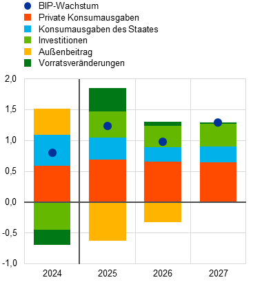 Das Wachstum des realen BIP dürfte weiterhin vom privaten Konsum getragen werden. Hinsichtlich der Verwendung (siehe Abbildung 2, Grafik a) wird projiziert, dass die privaten Konsumausgaben über den gesamten Projektionszeitraum hinweg kräftig wachsen und den größten Beitrag zum Wachstum des realen BIP leisten werden. Darüber hinaus dürften die staatlichen Konsumausgaben und Gesamtinvestitionen von 2025 bis 2027 jedes Jahr steigen. Dabei sollten die privaten Investitionen den erwarteten starken Klippeneffekt bei den öffentlichen Investitionen im Jahr 2027 ausgleichen, der sich aus dem Auslaufen der NGEU-Zuschüsse ergibt. Im Gegensatz dazu werden die Nettoexporte den Projektionen zufolge in den Jahren 2025 und 2026 einen negativen Beitrag zum Wachstum des realen BIP leisten. Dabei übersteigt der Beitrag der Importe (-1,2 Prozentpunkte bzw. -0,9 Prozentpunkte) den Beitrag der Exporte (0,6 Prozentpunkte bzw. 0,5 Prozentpunkte). Dies wird jedoch durch einen positiven Beitrag der Vorratsveränderungen im Jahr 2025 teilweise ausgeglichen (siehe Abbildung 2, Grafik b). Die sehr volatile Entwicklung der Vorratsveränderungen im Jahresverlauf 2025 hängt mit dem Lageraufbau und dem Lagerabbau im Zusammenhang mit Vorzieheffekten und ihrem Nachlassen zusammen.