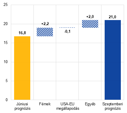 Megjegyzés: A függőleges vonal jelzi az előrejelzési időszak kezdetét. A módosítások kerekítetlen adatokon alapulnak. A csíkos, piros oszlop a 2025. első és második negyedévi eredményeknek az éven belüli növekedésre gyakorolt hatását mutatja.