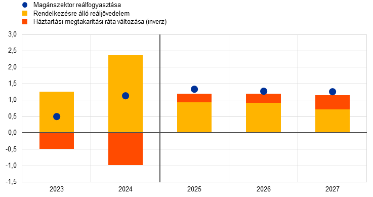 A reál-GDP növekedését várhatóan változatlanul a magánfogyasztás fogja ösztönözni. Kiadási szempontból [2. ábra, b) panel] a magánszektor fogyasztása a prognózis szerint az előrejelzési időszakban erőteljesen nő, és a legnagyobb mértékben járul hozzá a reál-GDP-növekedéshez. Emellett az állami fogyasztás és az összberuházás 2025-től 2027-ig várhatóan minden évben növekedni fog, és a magánberuházások ellensúlyozni fogják a közberuházásokban az NGEU keretében nyújtott támogatás megszűnéséből eredő, 2027-ben várható erős hirtelen kilengést. Ezzel szemben a nettó export a prognózis szerint 2025-ben és 2026-ban negatívan járul hozzá a reál-GDP-növekedéshez – az import hozzájárulása (−1,2 százalékpont, illetve −0,9 százalékpont) meghaladja az exportét (0,6 százalékpont, illetve 0,5 százalékpont) –, ezt azonban részben ellensúlyozni tudja a 2025-ös készletváltozások pozitív hozzájárulása [2. ábra, b) panel]. A készletek 2025 folyamán bekövetkező rendkívül volatilis változásai az előreütemezés hatásaival és azok lecsengésével összefüggő készletfelhalmozáshoz és készletcsökkenéshez köthetők.