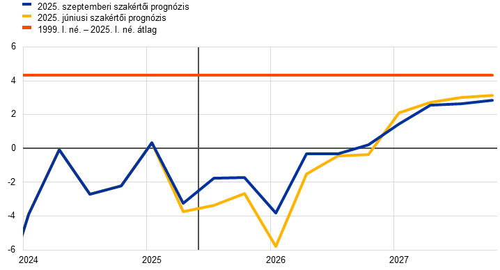 Az euroövezet gazdasági konjunktúrája 2025 második negyedévében 0,1%-kal nőtt, ami kissé elmaradt a júniusi prognózistól, miután az első negyedévben a vártnál sokkal erősebb volt (1. ábra). A 2025 első negyedévi eredmény és a 2024 negyedik negyedévére vonatkozó adatok felfelé módosítása következtében a második negyedévben a GDP mértéke még mindig mintegy 0,5%-kal volt magasabb a júniusi prognózisban előre jelzettnél. 2025 első negyedévében a növekedést erőteljesen támogatta az export előreütemezése, amelyre az USA magasabb vámtarifáira való felkészülés jegyében került sor. Ez a hatás a második negyedévben kezdett alábbhagyni, elsősorban – de nem kizárólag – az ír gyógyszeripari ágazatban bekövetkező fejlemények miatt. Az egyes szektorokat tekintve, az előütemezés hatásainak lecsengése közepette a második negyedévben az ipar teljesítménye visszafogott volt. Mindeközben folytatódott az áruk iránti kereslet fellendülése, amelyet a javuló reáljövedelmek ösztönöztek, míg a szolgáltatási szektor konjunktúrája tovább növekedett.