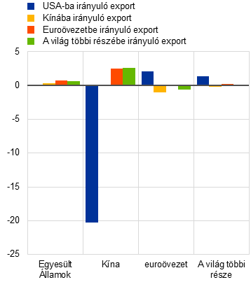 Megjegyzés: Az ábra a kétoldalú kereskedelem változását mutatja be 2027 negyedik negyedévében (súlyozatlan). Kína részben irányított devizaárfolyammal rendelkezik. A világ többi részének kiszámítása az EKB-Global modellben úgy történik, hogy az Egyesült Államokat, Kínát és az euroövezetet kizárva az összes régió exportjának eltéréseit vesszük, és ezek egyszerű átlagát képezzük.