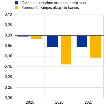 Į kitas šalis gali būti nukreipti didesni prekybos srautai, negu numatyta pagrindiniame scenarijuje, o Kinijos eksporto kainos gali būti mažesnės. Remiantis ECB-Global modelio rezultatais ir pagrindinio scenarijaus prielaidomis dėl muitų (aprašytomis 1 intarpe), iš JAV į euro zoną būtų nukreipiamas nedidelis prekybos srautas[13]. Tai reiškia, kad JAV importuotojai į kitas šalis nukreiptų tik nedidelę dalį prekybos su šalimis, kurioms taikomi didesni muitai, pavyzdžiui, su Kinija, ir kad siekiant kompensuoti muitų poveikį Kinijos eksporto kainos būtų mažinamos nedaug. Analizuojami du pagrindiniam scenarijui alternatyvūs scenarijai. Pagal pirmąjį JAV importuotojai nukreipia paklausą iš Kinijos į euro zoną ir kitas pasaulio šalis. Pagal antrąjį Kinijos eksportuotojai reaguoja į aukštesnes JAV prekybos kliūtis mažindami eksporto kainas visiems savo prekybos partneriams, kad visiškai kompensuotų tokių kliūčių poveikį jų bendram eksportui.