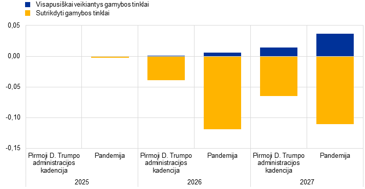 Pagal pirmąjį alternatyvų scenarijų makroekonominis poveikis euro zonai būtų minimalus, o pagal antrąjį, kuriame numatyti ekstremalesni tiekimo grandinės trikdžiai, kaip buvo pandemijos laikotarpiu, poveikis euro zonai būtų didelis. Pirmiausia nagrinėjant ekonomikos rezultatus, kai gamybos tinklai visapusiškai veikia, matyti, kad pagal ECB-BASE modelį ir tiekimo trikdžių, panašių į kilusius per pirmąją D. Trumpo administracijos kadenciją, scenarijų infliacinis spaudimas tebūtų minimalus, o infliacija pagal SVKI 2027 m. būtų didesnė mažiau negu 0,1 procentinio punkto (žr. 20 pav. b grafiką, mėlyni stulpeliai). Pagal scenarijų, kuriame numatomi sukrėtimai, panašūs į kilusius pandemijos laikotarpiu, poveikis infliacijai būtų didesnis – 2027 m. infliacija pagal SVKI būtų didesnė iki 0,15 procentinio punkto (žr. 20 pav. b grafiką, mėlyni stulpeliai). Pagal abi jautrumo analizes poveikis realiajam BVP yra nereikšmingas arba nedidelis teigiamas ir atspindi prielaidą, kad palūkanų normos nesikeis, bet dėl padidėjusios infliacijos realiosios palūkanų normos mažės ir tai skatins ekonominį aktyvumą (žr. 20 pav. a grafiką, mėlyni stulpeliai). Analizė išplečiama naudojant daugiašalį daugiasektorinį modelį, kuriame atsižvelgiama į sąnaudų–produkcijos sąsajas ir daroma prielaida, kad trikdžiai ne tik blokuos tiekimo grandinę, bet ir trikdys kitų regionų gamybos tinklus. Šiai prielaidai pasitvirtinus, sumažėtų pakeičiamumas gamybos grandinėse ir poveikis būtų didesnis (žr. 20 pav., geltoni stulpeliai). Tokiu atveju, palyginti su pagrindiniu scenarijumi, pagal pirmosios D. Trumpo administracijos kadencijos scenarijų infliacija 2027 m. galėtų būti iki 0,1 procentinio punkto didesnė, pagal ekstremalesnį pandemijos scenarijų – beveik 0,25 procentinio punkto didesnė, o BVP augimas būtų šiek tiek mažesnis[19].